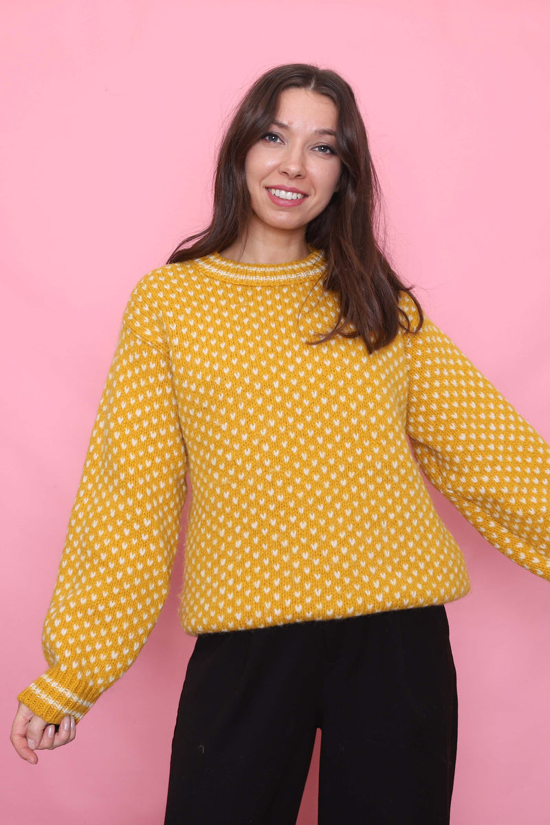 Model wearing a vintage black and white zip-up knit cardigan with Nordic pattern