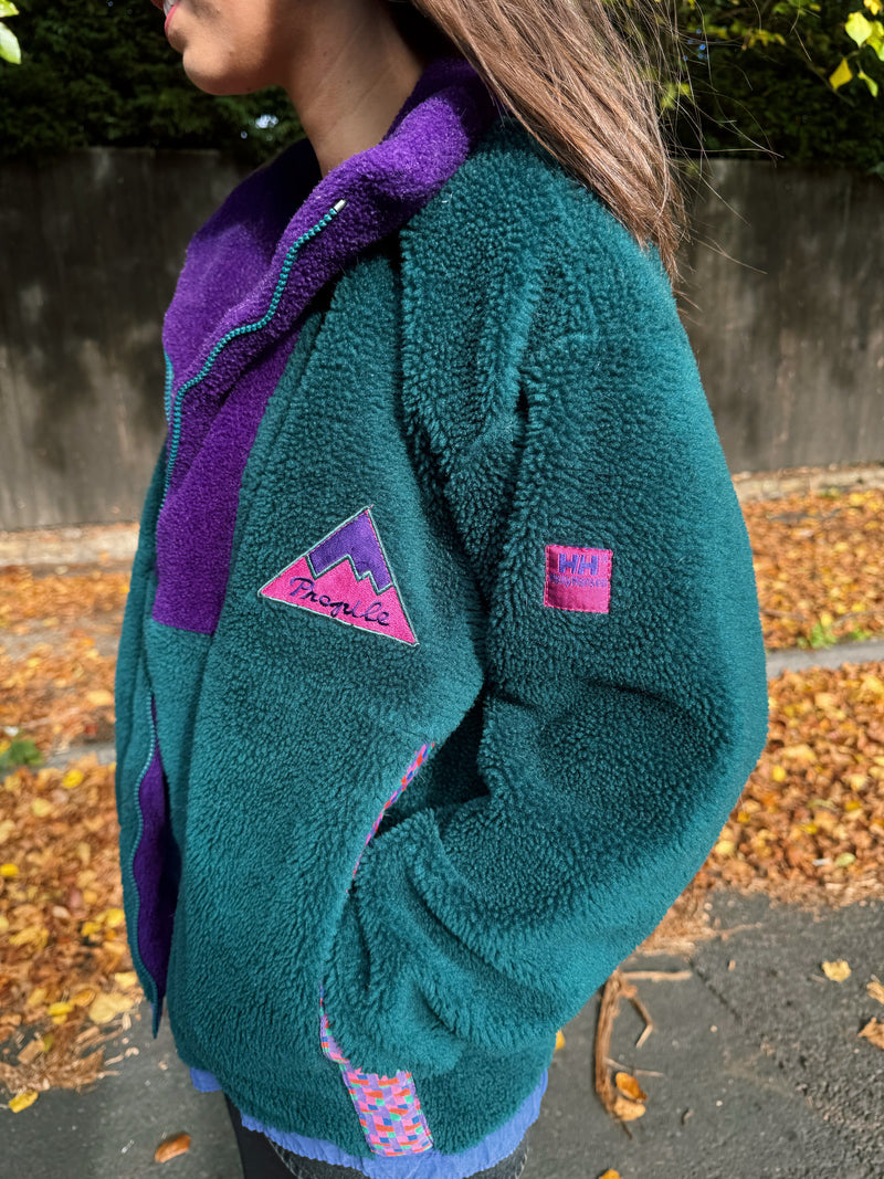 Model wearing a vintage navy Berghaus full zip Polartec fleece jacket with logo