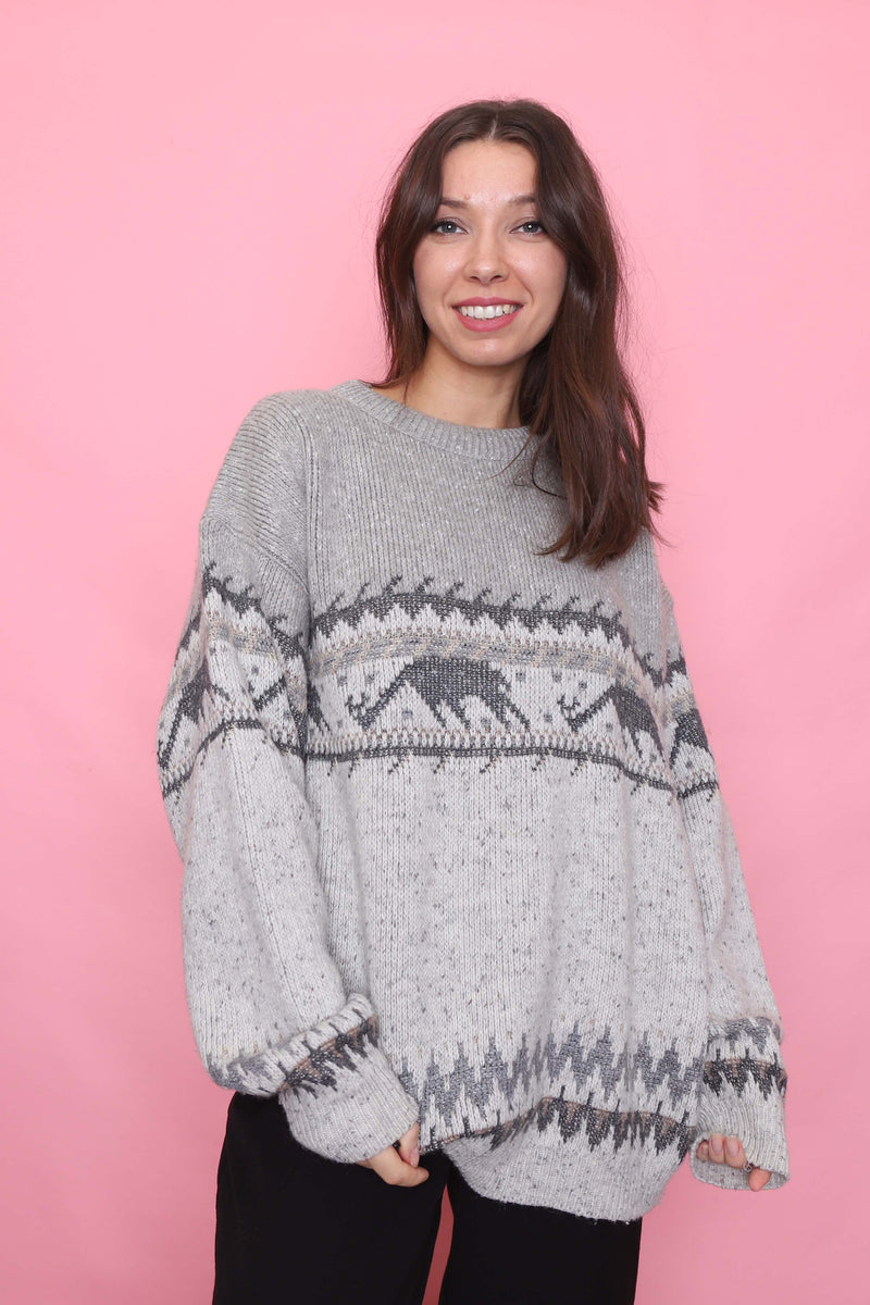 Vintage Abstract Pattern Grey Shawl Collar Knit Jumper