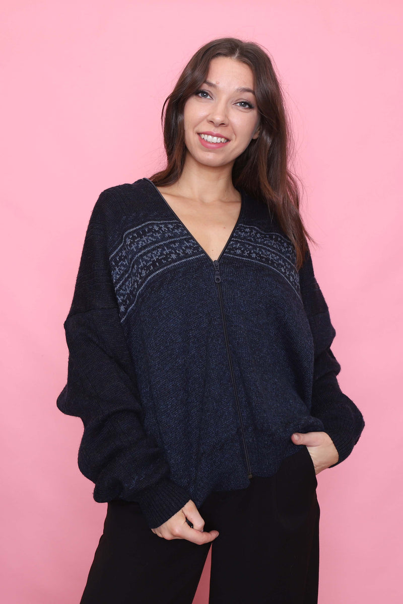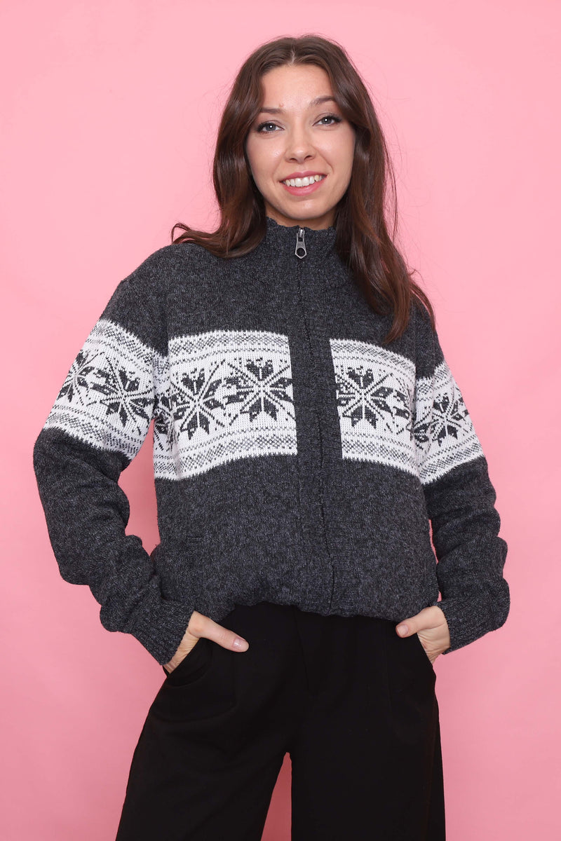 Vintage Charcoal Zip-Up Nordic Knit Cardigan Fleece-Lined