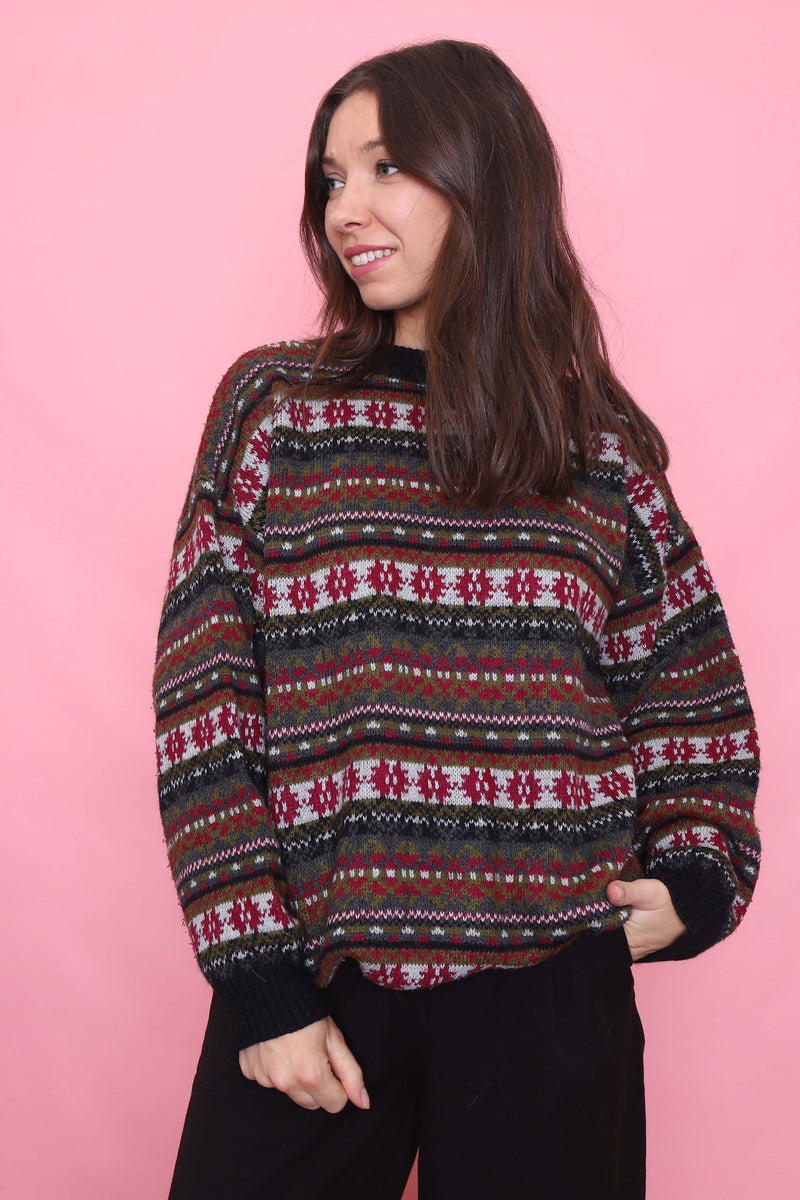 model wearing vintage Nordic-style patterned cardigan with red and blue accents