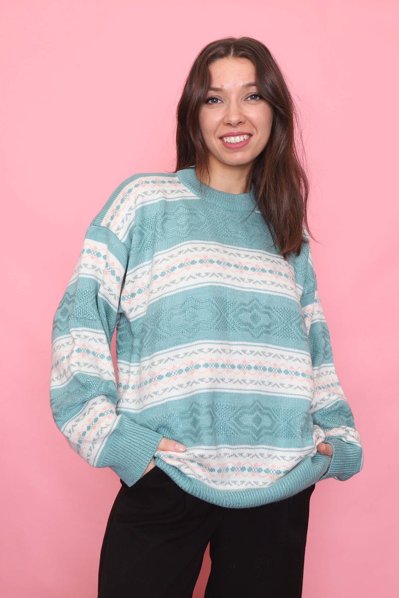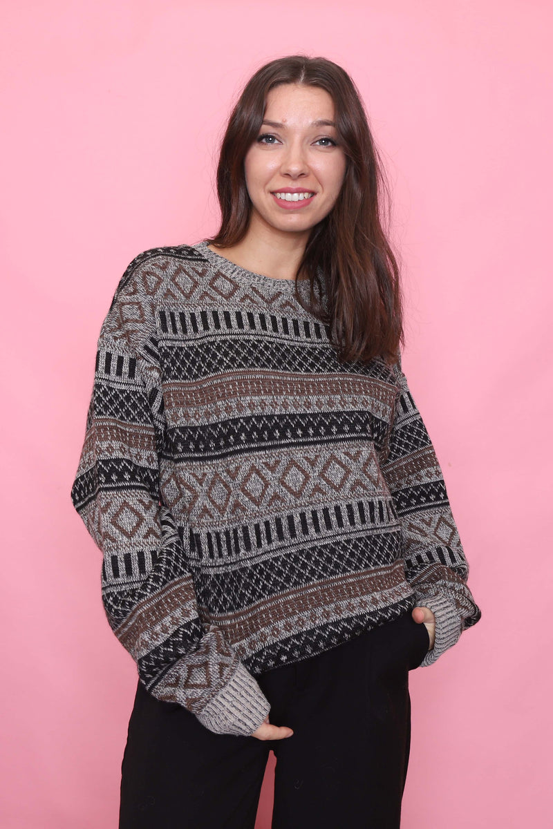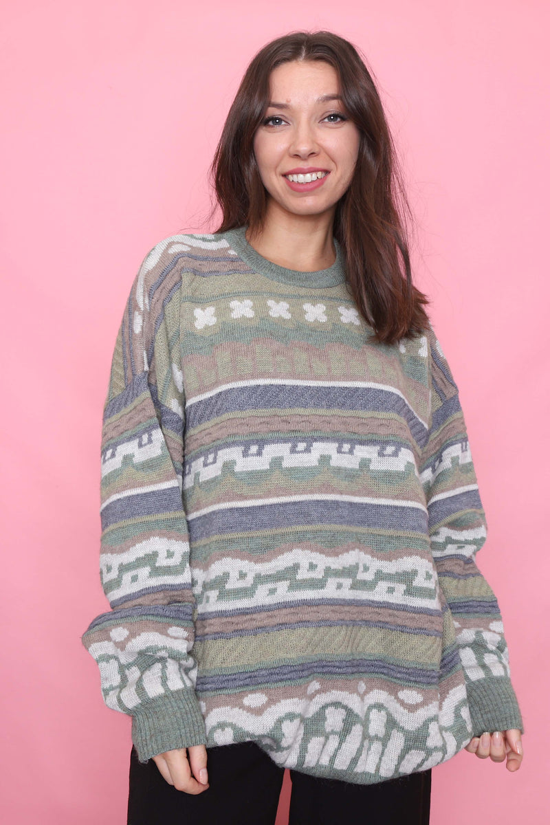 Model wearing a 90s vintage light grey knit jumper with a textured front pattern – minimalist unisex sweater.