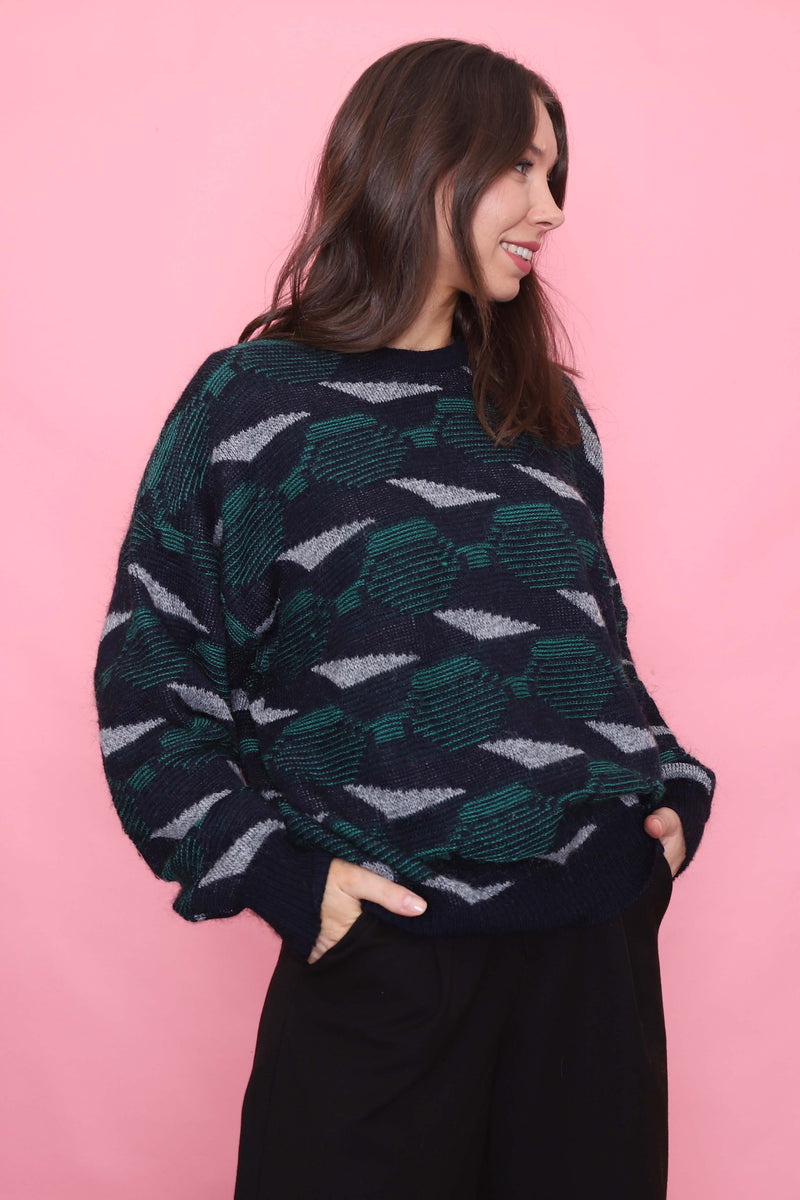 Model wearing a vintage navy blue button-up cardigan with patch pockets and ribbed cuffs